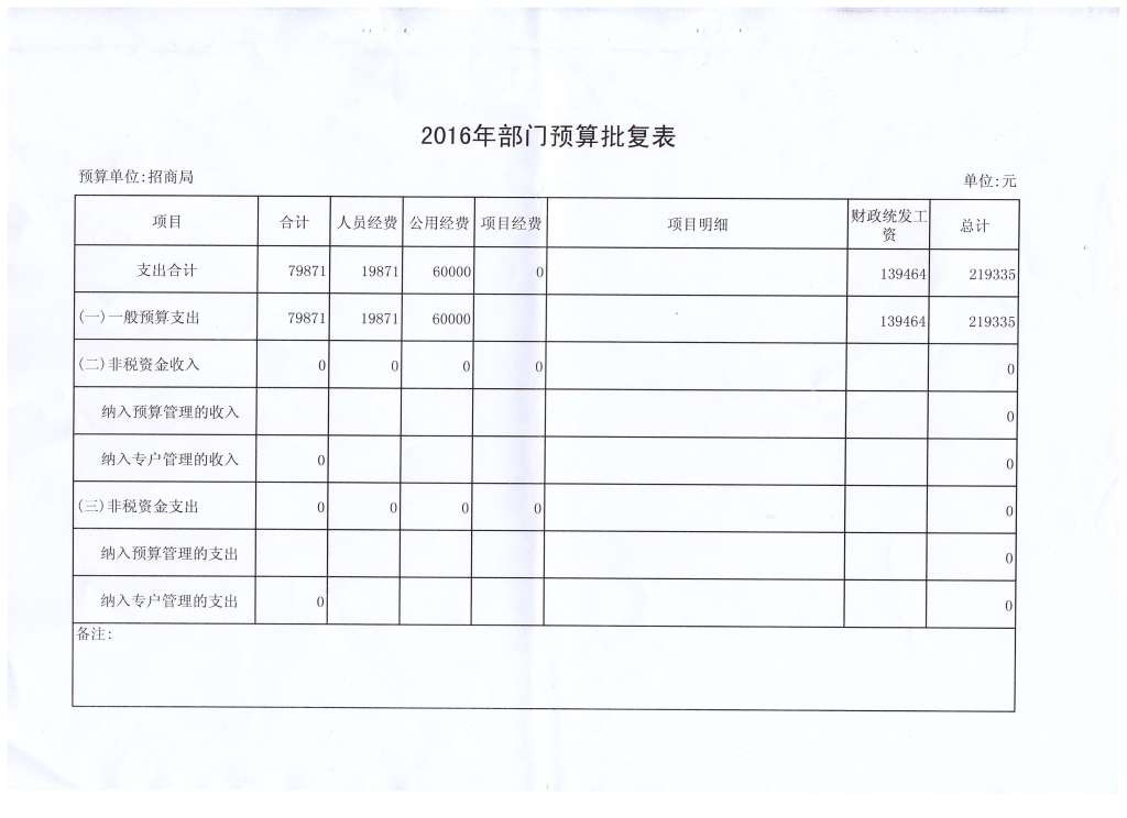 西峡县招商局2016年预算批复表